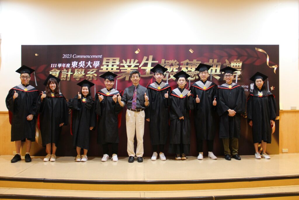 【111學年度會計學系畢業生撥穗典禮】 發佈日期: 2023 年 5 月 31 日2023 年 5 月 31 日 作者: acc.alumni 5月27日(六)是東會人重要的日子,恭喜今年的畢業生們即將邁入人生新的一段旅程! 本年度於校本部普仁堂舉辦溫馨隆重的撥穗儀式。會計學系用滿滿的祝福歡送畢業生勇敢地朝向夢想展翅高飛,同學們也藉此機會感謝師長們多年來的教導! – 撥穗典禮的照片也出爐囉! Google相簿連結請點此:https://photos.app.goo.gl/FVEDYyyTXxj1VdwC6 【師長致詞】 【各班合照】 【畢業生代表致詞】 【師長與同學撥穗合照】